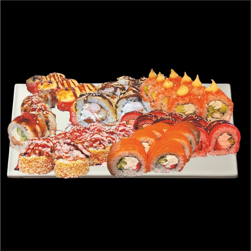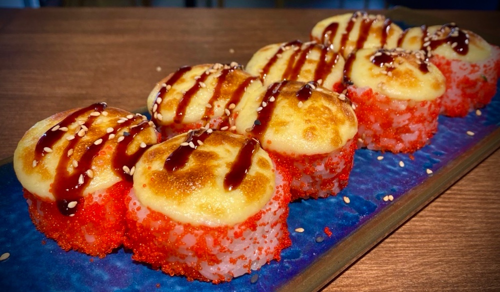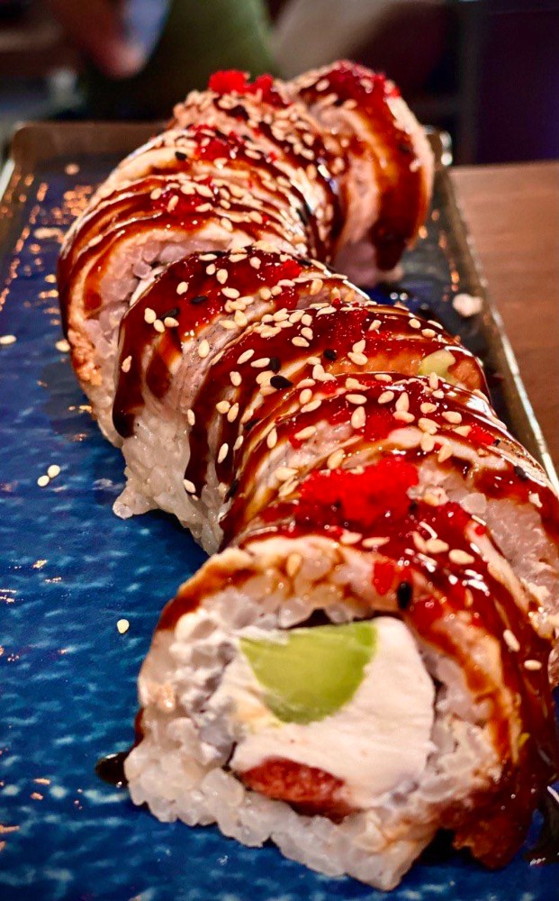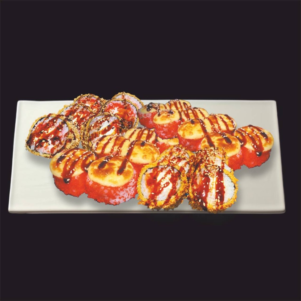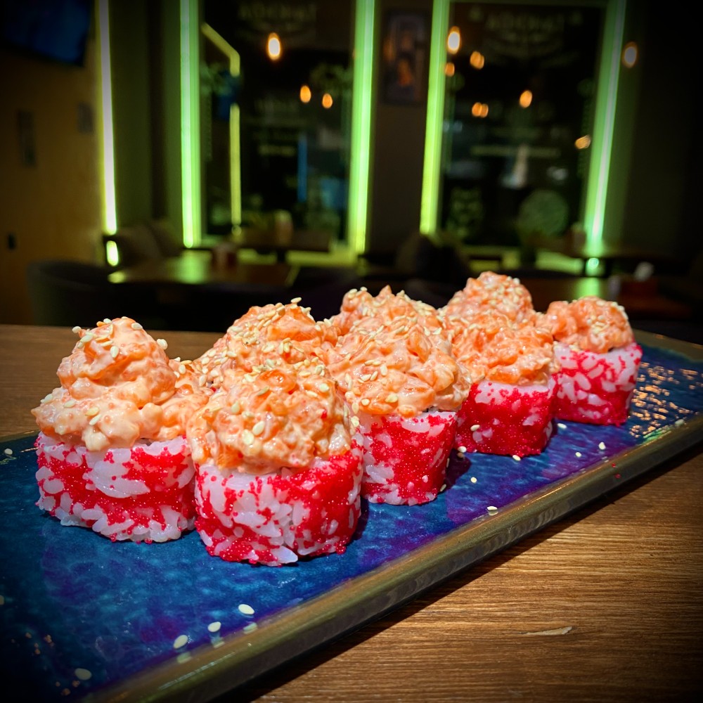 Рис ,норі ,тунець,соус спайсі ,сир філо ,тобіко ,огірок ,авокадо,кунжут .Імбир ,васабі ,соєвий соус ,палички.8 шматочків 260г