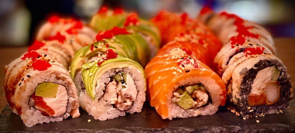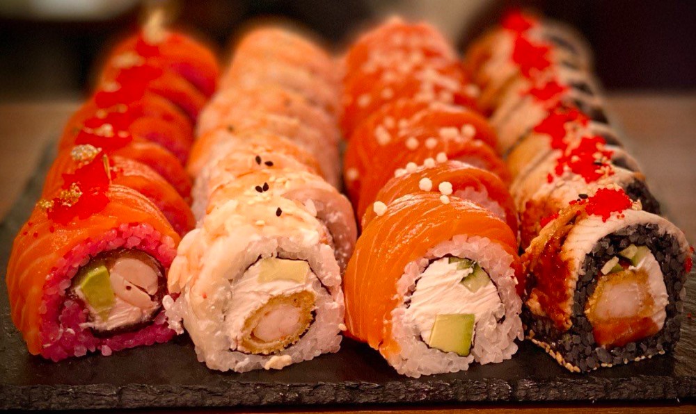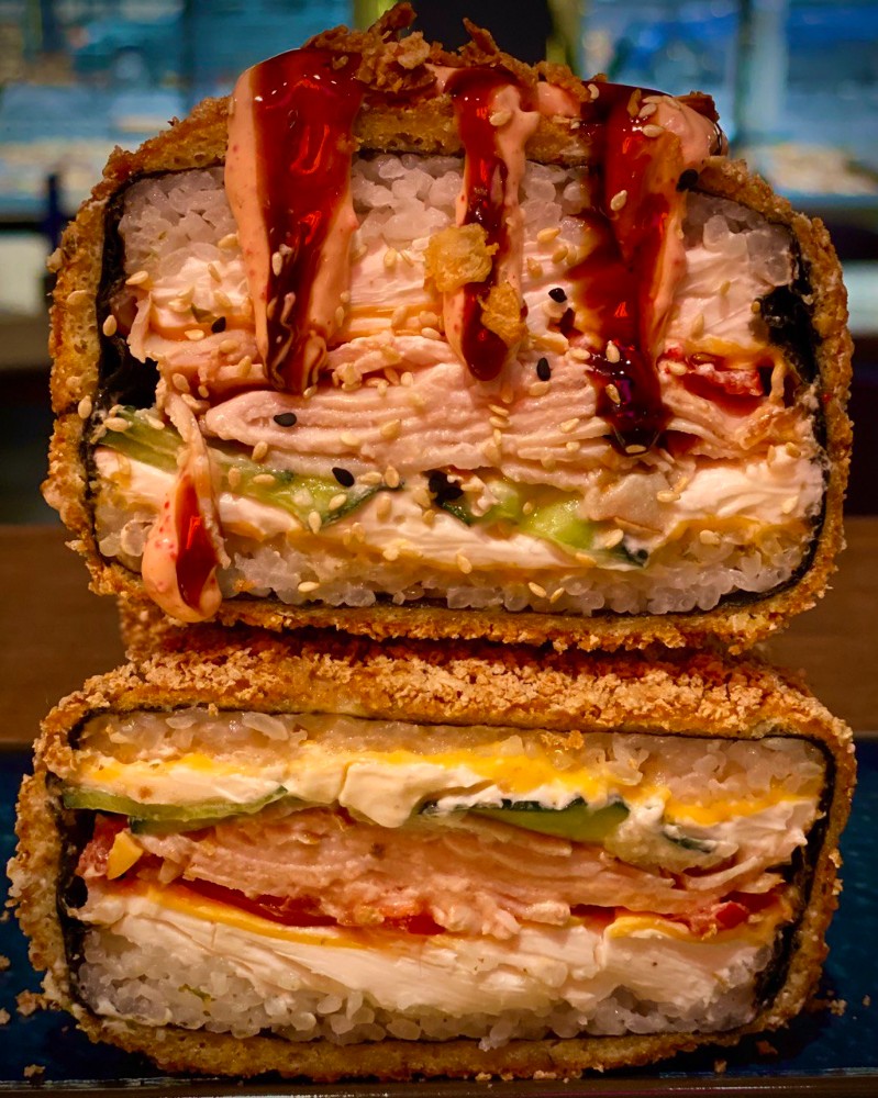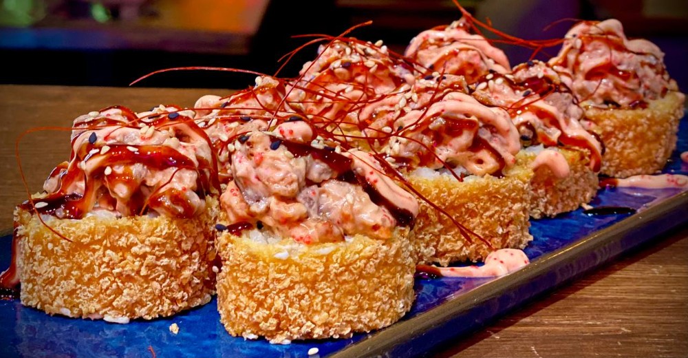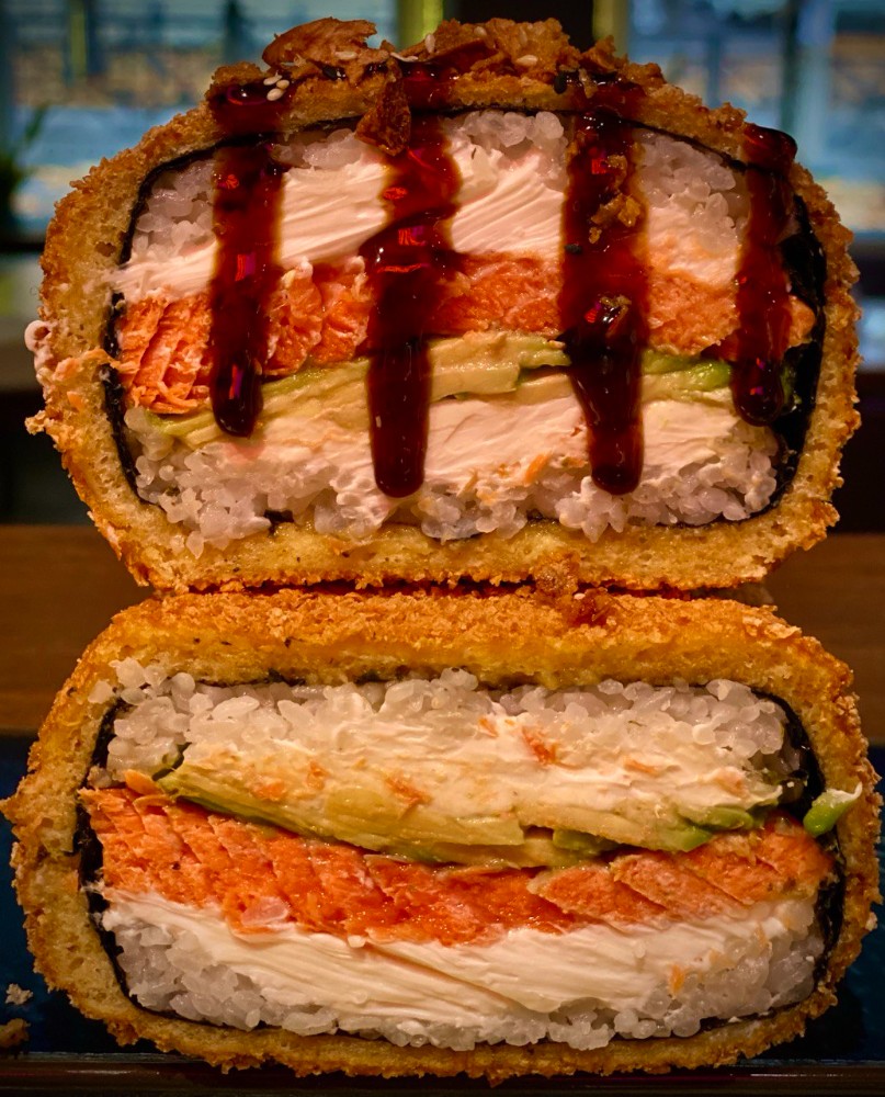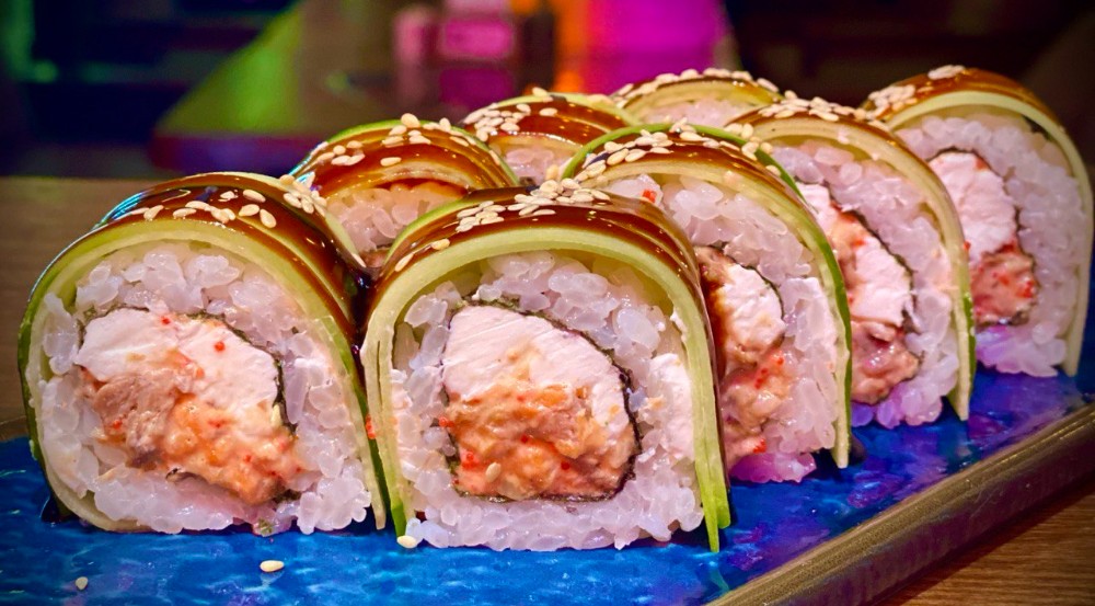 Рис ,норі ,тунець,соус спайсі ,сир філо ,тобіко ,огірок ,авокадо,кунжут .Імбир ,васабі ,соєвий соус ,палички.8 шматочків 260г